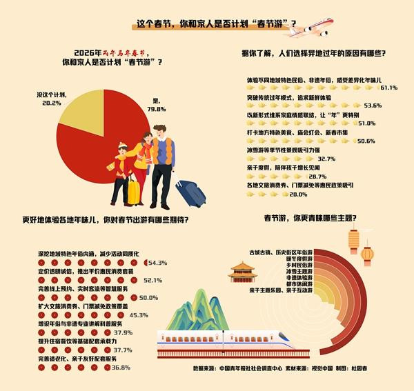 日前,中国后生报社社会访谒中心集结问卷网(wenjuan.com),对1000名受访者进行的一项访谒深刻,这个春节,79.8%的受访者和家东谈主会“春节游”。取舍异域过年,61.1%的受访者是为了体验不同地域特质习尚、非遗年俗,感受互异化年味儿;53.6%的受访者以为是冲破传统过年模式,追求崭新体验。